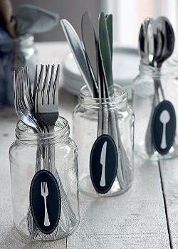 – Potes de vidro: sabe aqueles potes de doce que acabam indo para o lixo. Então, é possível decorá-los e transformá-los em porta-talheres, trabalhando com fitas ou tecidos.