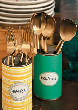 – Latas: seja de achocolatado ou leite em pó, elas também podem virar organizadores à disposição em uma mesa. Basta decorá-las que elas ganham uma nova funcionalidade.