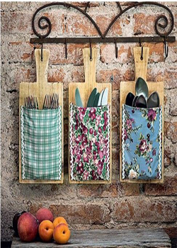 – Tábuas para bolso vertical: a sugestão é utilizar uma tábua de carne e fazer uma espécie de bolso com tecidos. Assim, ganha-se a possibilidade de fixá-la em algum lugar. A composição da peça pode ser projetada de acordo com o gosto de cada um.